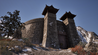 Das massive Holztor des Tempels wird von zwei hohen Türmen eingefasst, von deren Spitze aus man weit das den Tempel umgebende Gebiet überblicken und somit potentielle Bedrohungen schnell erkennen kann.[13] Hat man das Tor durchschritten führt eine steinerne Treppe zu einer kleinen Plattform in einer Art Innenhof in Halbkreisform, welcher von der massiven Mauer des Wolkenherrschers gebildet wird. Ob und wenn was für eine Funktion diese Konsruktion besitzt ist nicht bekannt, es könnte sich dabei jedoch um eine für die Verteidigung des Tempels bedeutende Anlage sein.[14]
