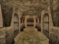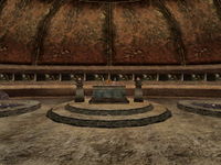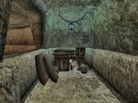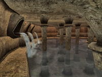 Ignoriert man die Türen und folgt dem Gang findet man nach einer Linkskurve einen ungewöhnlichen Ort auf. Ein Großteil des Raumes ist wie bei einem Wasserbecken mit Wasser gefüllt. Die Decke wird von sechs großen Säulen getragen und an dem kleinen Pfad links an der Seite sprudelt Wasser wie bei den Kanälen in Vivec aus, mit Gittern geschützten Rohren, in das Becken. Der Raum wird von zwei Schlachterfischen bevölkert, die möglicherweise für den Tod der Leiche, die im Wasser liegt, verantwortlich sind. Zudem liegt am Beckengrund, etwas versteckt in einer Ecke, eine große, mit Schlössern gesicherte Truhe.