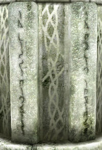 Laut dem Prophet liest sich diese Inschrift als As oiobala Umarile, Ehlnada racuvar, was sich aus dem Ayleïdischen zu Durch die ewige Macht von Umaril sollen die sterblichen Götter niedergeschlagen werden. übersetzt.[3] In der Inschrift ist im letzten Wort allerdings eindeutig ein Y zu erkennen, da sowohl die Y-Rune als auch die V-Rune bereits aus der anderen Inschrift bekannt sind. Das letzte Wort heißt somit nicht racuvar, sondern racuyar. Mögliche Erklärungen dazu sind: