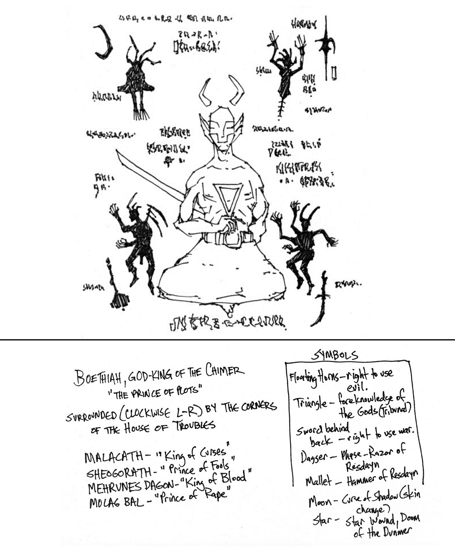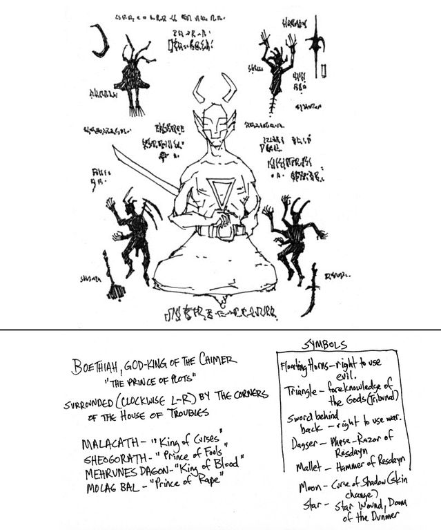 Boethiah, Gottkönig der Chimer, umgeben von Malacath, Sheogorath, Dagon und Molag Bal. Zusammenfassung von Zeichnung & Erklärungen auf Michael Kirkbrides tumblr.