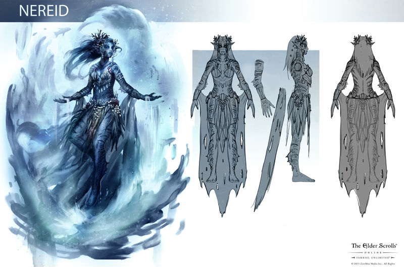 Hier seht ihr eine Konzeptgrafik für eine Nereïde, eine der Kreaturen in ESOTU, die im Laufe des Entwicklungsprozesses visuell angepasst und optimiert wurde. Die Nereïden gehören zum Volk der Wassergeister und werden häufig mit den Nymphen aus Daggerfall verwechselt. Sie sind in gewisser Weise das im Wasser lebende Pendant der Zweiglinge, doch sie besitzen eine höhere Intelligenz und haben ein besseres Verständnis für ihre Umgebung. Wie ihr Aussehen bereits vermuten lässt, sind sie hauptsächlich in der Nähe von Wasser anzutreffen.