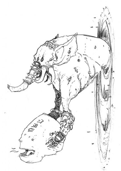 Haupt der All-Muhgs. Zeichnung von Michael Kirkbride, Clavicus Vile und Barbas darstellend. Originalquelle unbekannt, via r/teslore, Thread A forgotten MK drawing of an elephant-headed cosmic being.