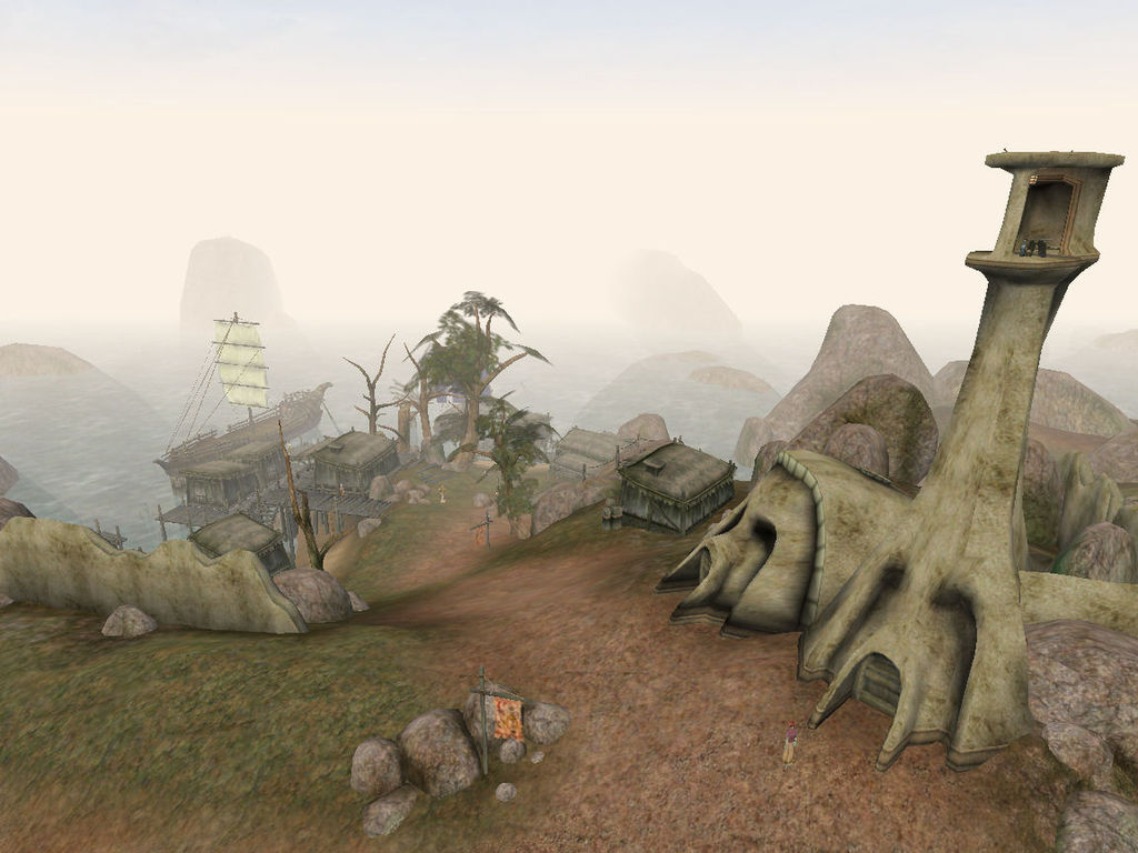 Das Fischerdorf Ald Velothi an der Westspalte von Vvardenfell. Rechts im Vordergrund befindet sich der Außenposten der Redoran.