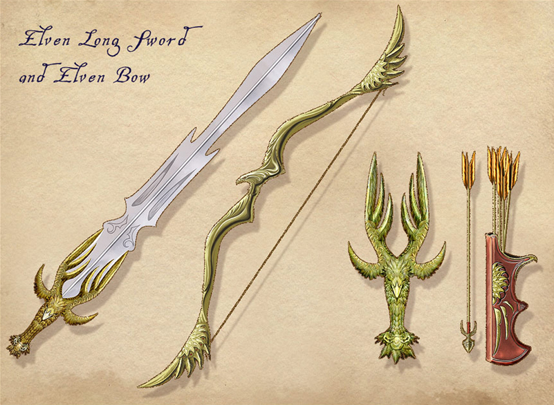 Zeichnung eines Elfenlangschwert und eines Elfenbogens aus Oblivion
