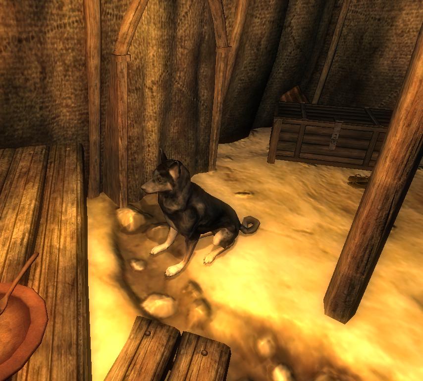 • Beschreibung: Dieses Bild zeigt Pumpkin den Hund des Anführers der Schwarzbogen-Banditen in Inneren des Zeltes Felsenmilch-Zuflucht.