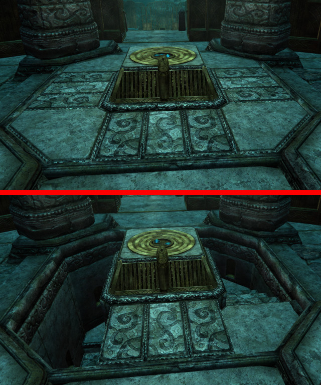 Ein komplizierter Zwergenmechanismus dient als Schloss für den versteckten Zugang zur Schwarzweite in der Dwemer-Ruine Alftand. Er kann nur mit einer Anpassungssphäre geöffnet werden.