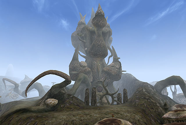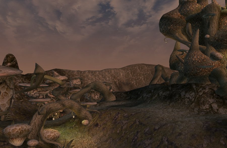 Dieses Bild wurde mit Hilfe des Morrowind FPS Optimizers v2.00 aufgenommen. Durch diesen wird durch die Änderung eines Registry-Eintrags die maximale Sichtweite im Spiel von 7168 auf 14336 Editoreinheiten erhöht (also verdoppelt).