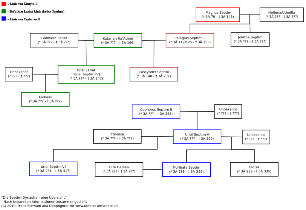 Ausschnitt aus dem Stammbaum der Septim-Dynastie mit deutlicher Darstellung des Sprungs zwischen der Hauptlinie, der Ra-athim-Lariat-Linie und der Linie von Cephorus II.