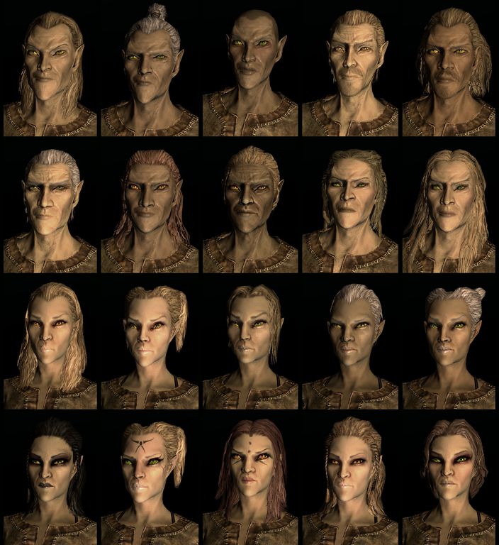 Eine Zusammenstellung verschiedener Möglichkeiten bei der Charaktergenerierung von Altmer in The Elder Scrolls V: Skyrim.