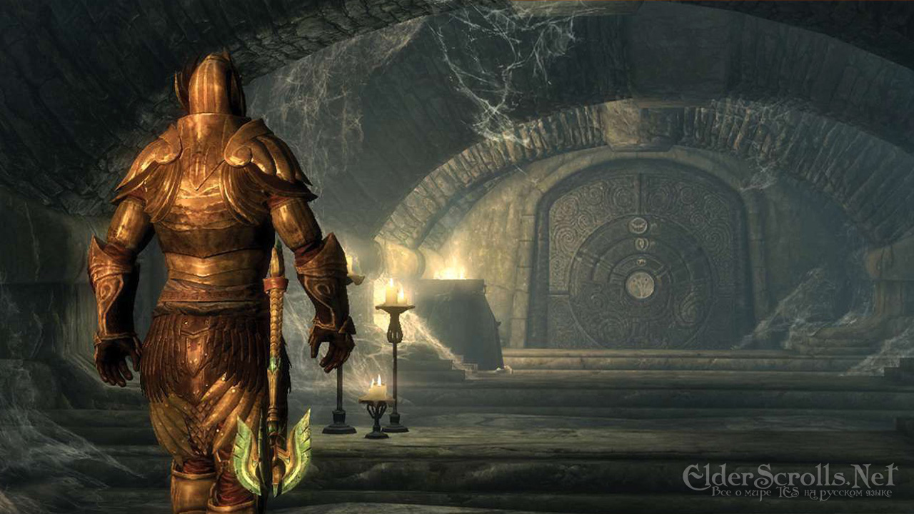 Spieler in goldener Rüstung vor verschlossener Steintür.