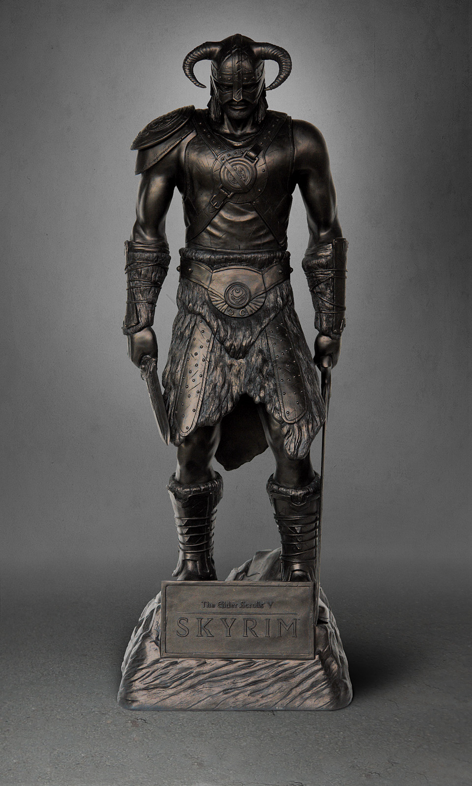Eine Statue des Drachenbluts. Zu Werbezwecken wurde eine Armee aus bronzenen Nord-Statuen, die alle dem Spielcharakter aus dem ersten Trailer nachempfunden wurden.