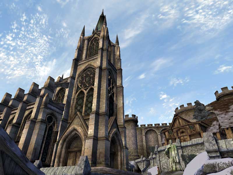 Das Wahrzeichen der Stadt Bruma: Die Kapelle von Talos. Die Statue vor der Kapelle stellt selbigen dar.