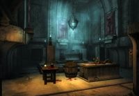 Geht man von der Kreuzung geradeaus weiter erreicht man im weiteren Verlauf über zwei Zugänge eine größere Grabkammer. Totenbeschwörer haben dieses Grab in ein “Labor” verwandelt, in der sie dem Praktizieren des Totenkults nachgehen.