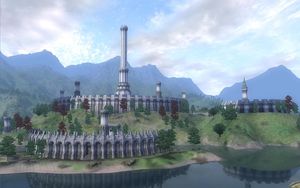 Die Kaiserstadt mit dem Weißgoldturm von Südwesten aus. Im Vordergrund das Hafenviertel, rechts die Arkane Universität. | |