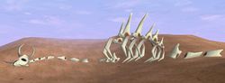 - ↑ Im Kleinen Tamriel-Almanach (3. Auflage), Kapitel Pyandonea werden Seeschlangen erwähnt. Eine nähere Beschreibung zu ihnen gibt es jedoch nicht. Gegen das Skelett eines Drachen spricht, dass keine Flügel sichtbar sind. Allerdings könnten diese auch unter dem Sand versteckt sein.