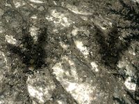 - ↑ Vermutung aufgrund der dunkleren Verfärbung des Materials gegenüber den Knochen.