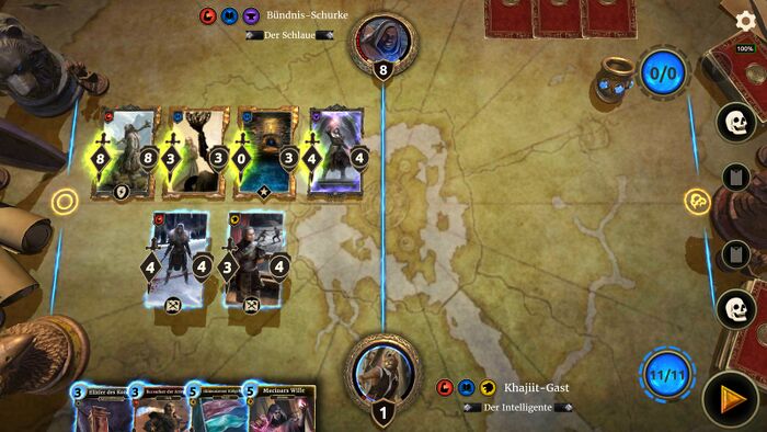 Ihr besitzt 1 Gesundheit. Ihr habt 1x Gildentreue Blutgierige und 1x Angesehener Ausbilder in der Feld-Reihe. Vier Karten befinden sich auf eurer Hand: Elixier des Konflikts, Berserker der Kriegergilde, Gildentreuer Eidgebundener und Mecinars Wille.