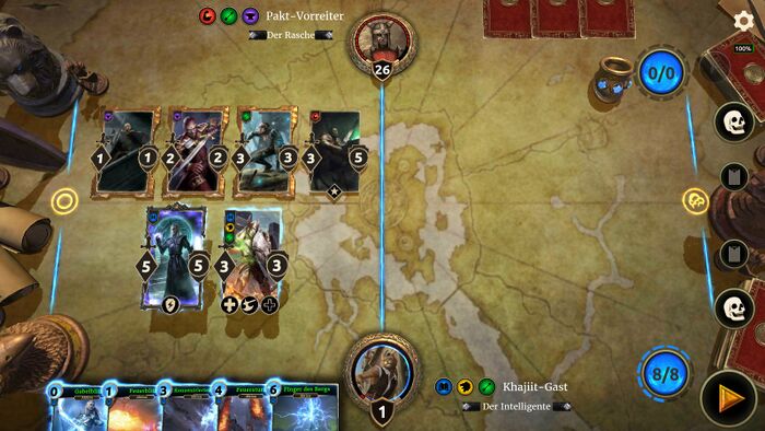 Euer Gegner besitzt 26 Gesundheit. Er hat 1x Auferstandener Toter, 1x Colovianischer Soldat, 1x Schwarzsaft-Hüter und 1x Ärgersucher in der Feld-Reihe.