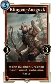 - Ausgucke: Diese Ausgucke sind Kreaturen, die 3 Magicka kosten und eine passive Fähigkeit haben, die auslöst, wenn du einen Drachen beschwörst. Dies sind zum Beispiel: eine Karte ziehen, 4 Gesundheit erhalten, einen 1/1-er Spielstein beschwören. Alle Ausgucke sind: