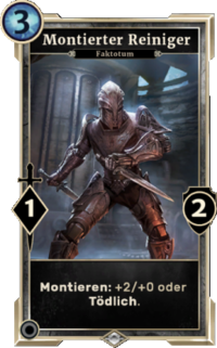Der neue Kreaturentyp Faktotum besitzt die ebenfalls neue Fähigkeit Montieren. Wenn ihr einen Faktotum ausspielt werdet ihr vor die Wahl gestellt einen von zwei Boni auf die Kreatur anzuwenden. Allerdings nicht nur auf die gerade ausgespielte Kreatur. Der Bonus wird auch auf jeden Faktoten angewandt, der sich noch auf eurer Hand oder in eurem Deck befindet. So könnt ihr beim Ausspielen des Montierten Reinigers wählen, ob alle zukünftigen Faktoten Tödlich oder +2/+0 erhalten sollen. Durch die Kombination vieler ausgespielter Faktoren lassen sich so sehr starke Kreaturen erzeugen.