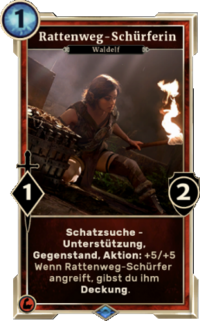 Karten mit dem Schlüsselwort Schatzsuche lösen eine besondere Fähigkeit aus, wenn alle angegebenen Kartentypen gezogen wurden. Die Fähigkeit des Reliktjägers löst beispielsweise aus, wenn ihr einen Gegenstand zieht, und verstärkt diesen Gegenstand dann direkt. Bei der Rattenweg-Schürferin ist es etwas komplizierter. Sobald ihr mindestens eine Aktion, einen Gegenstand und eine Unterstützung gezogen habt (während sie im Spiel ist), erhält die Schürferin +5/+5.