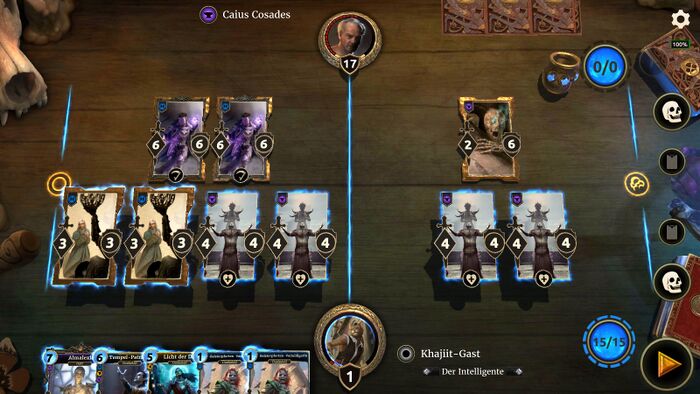 Euer Gegner besitzt 17 Gesundheit. Er hat in der Feld-Reihe 2x Indoril-Erzmagier und in der Schatten-Reihe 1x Lauernde Mumie.