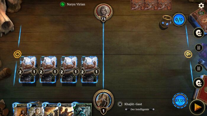 Ihr besitzt 1 Gesundheit. Ihr habt 4x Wütende Schlammkrabbe in der Feld-Reihe. Auf eurer Hand befinden sich fünf Karten: Hlaalu-Eidgebundene, Ayrenn, Doppelgänger, Ulfrics Aufstand und Schattengrün-Älteste.