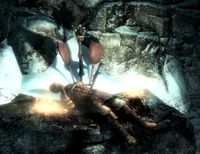 Doch dann schlugen die Falmer zu: In Begleitung mit Chaurus brachen die Schneeelfen aus einem verborgenen Tunnel im Keller, erschlugen Ramati und verschleppten die Geschwister in ihre eisigen Tiefen des Frostflussschlundes. Während Sudi tiefer in die Höhlen verschleppt wurde, ereilte Mani sein Schicksal bereits im Eingangsbereich der Höhle, als er auf einem kruden Altar geopfert wurde.[3]
