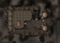 Wäre man ganz zu Anfang in Makis Halle anstatt rechts den Altarraum zu betreten, weiter geradeaus gegangen, käme man innerhalb sehr kurzer Zeit zu einer, bei Dunmerfestungen oft anzutreffener, Tür. Betritt man den nächsten Bereich, landet man in einer riesigen, prächtigen Halle. Sie ist doppelt so hoch wie gewöhnliche Räume in Dunmerfestungen und in ihr existieren zwei Höhenebenen. Betritt man also diese Räumlichkeit, erstreckt sich vor einem ein schmaler Pfad, von dem aus man die ganze Halle überblicken kann. Am Ende des Pfades angekommen, findet man die einzige Einbuchtung in die Wand, die gut durch eine Kohlepfanne beleuchtet wird. In dem Bereich des oberen Pfades wacht ein Feuer-Atronach, der Fremden nicht ungeschoren Durchlass gewährt.