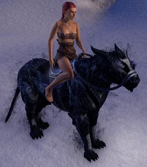 „Dieser aus dem Reich des Vergessens beschworene Schattenatronach wurde noch ein wenig prachtvoller, da er in die Form eines Senchereittiers gezwungen wurde. Bei all jenen beliebt, die sich schnell und leise durch die gefährlichen Teile Tamriels bewegen möchten.“