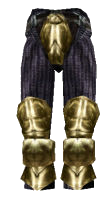 Die Beinschienen der Rüstung bestehen aus einer Kettenhose und einer Panzerung der Kniegelenke. Zusätzlich zählt zu den Beinschienen noch ein goldener Intimschutz, der am Gürtel befestigt wird. Die Kettenhose ist aus einem lila Metall gefertigt. Das Kniegelenk wird auf jeder Seite durch zwei goldene Panzerplatten geschützt. Dabei wird jeweils eine der Panzerplatten am Oberschenkel und eine am Unterschenkel getragen. Durch das Überlappen dieser Platten, ist das Knie optimal geschützt. Die Panzerplatte am Unterschenkel geht direkt in den Stiefel der Rüstung über.