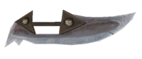 Die Waffe besitzt einen aus Holz gefertigten Griff. Die Klinge ist mit zwei Metallbolzen am Griff befestigt. Die Klinge selbst ist sehr breit und zieht sich komplett am Griff vorbei nach unten. Somit dient die Klinge selbst in gewisser Weise als Handschutz. Die Klinge endet in zwei Zacken, die sich unterhalb der Hand befinden. Durch diese ist es möglich im Kampf auch beim Schlag mit dem Griff der Waffe noch Verletzungen zuzufügen.