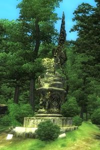 Auf dem Vorplatz der Ruine zwischen den beiden kleinen Türmen und vor der Treppe zum Hauptturm ragt eine große, gut erhaltene Ayleid-Statue in den Himmel.