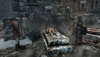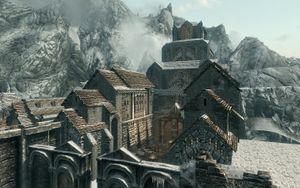 Im Friedhofsbezirk werden die Toten der Nord bestattet. Verstorbene anderer Rassen sind hier nicht zu finden, womöglich ein Zeichen der weit verbreiteten Fremdenfeindlichkeit.[13] Es werden regeläßig Gedenk- und Beerdigungsriten durchgeführt.[14] Angrenzend zum Friedhofbezirk befindet sich die Halle der Toten sowie der Tempel von Talos. Die Talosverehrung, welche durch die Thalmor im ganzen Kaiserreich verboten wurde, war hier stark politisiert, was sich durch die Stadtbanner im Tempel erkennen lies.