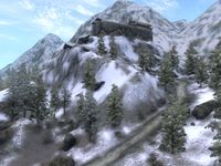Die Lage des Wolkenherrscher-Tempels auf einem Bergplateau in den Jerall-Bergen im Norden Cyrodiils begünstigt die Verteidigung der Festung. Die Anlage ist nur über eine einzige, kurvige Straße aus erreichbar und ansonsten von hohem und steilem Fels umgeben, was einen Angriff zwar erschwert, eine Belagerung jedoch erleichtert.[25] Darüber hinaus bildet die exponierte Lage einen idealen Überblick über das umliegende Land, weshalb Bedrohungen für den Tempel schon recht früh entdeckt werden können.[13]