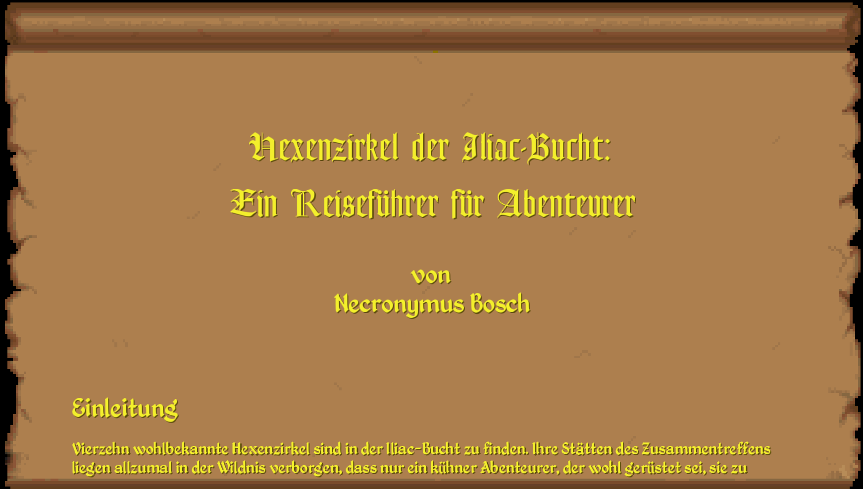 Dies ist die deutsche Übersetzung von harbinger451 Originalmodifikation, An Adventurer's Guide to Witch Covens (dt.: "Ein Abenteuer-Reiseführer für Hexenzirkel"). Sie fügt dem Spiel ein neues Buch hinzu: „Hexenzirkel der Iliac-Bucht: Ein Reiseführer für Abenteurer“, das Euch verrät, wo Ihr die (sonst) berüchtigt schwer auffindbaren Hexenzirkel finden könnt - nicht mehr und nicht weniger.