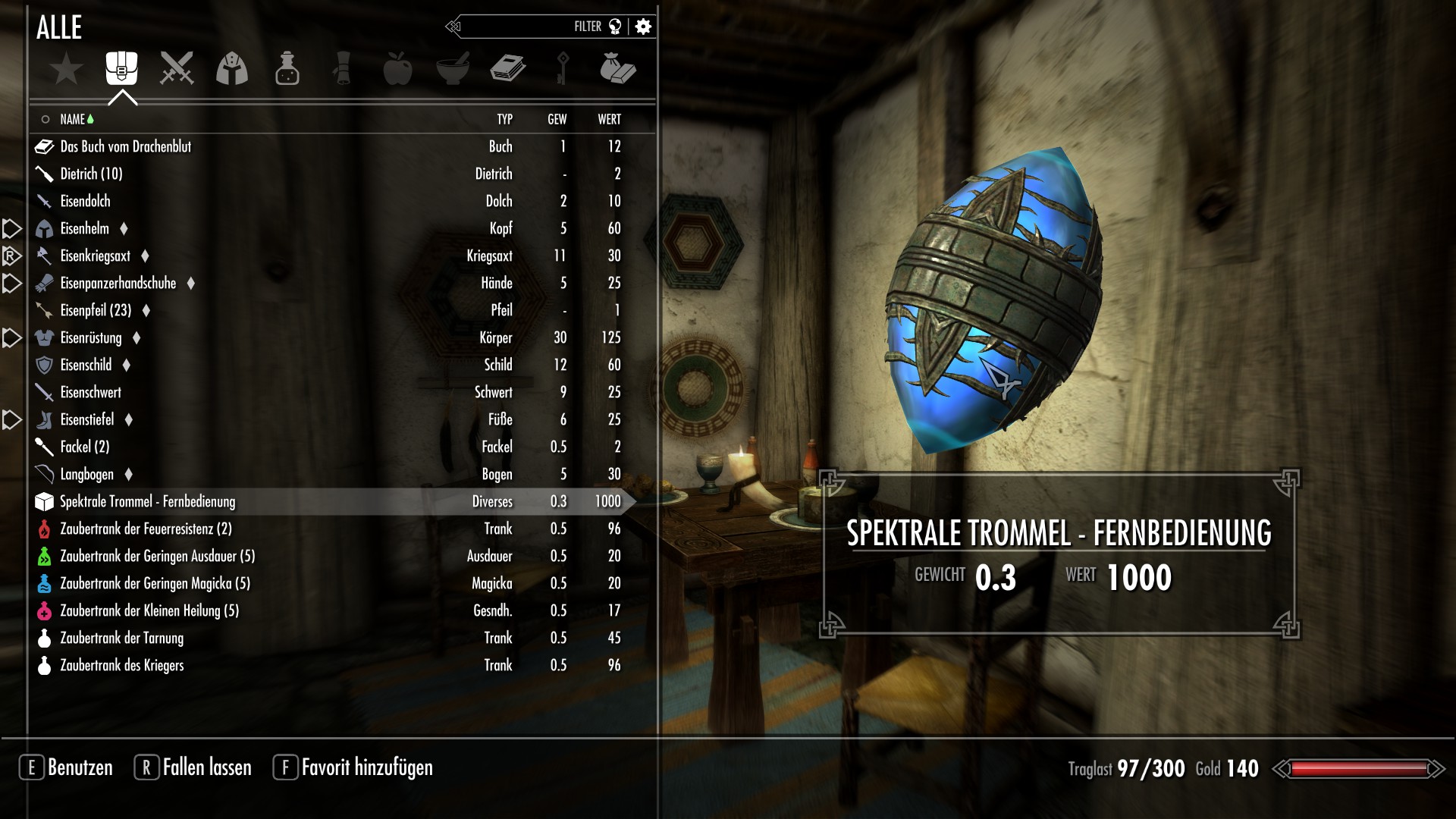 Die Spektrale Trommel aus der Quest Unerzählte Legenden begleitet dich als Musikabspieler auf deinen Reisen. Rufe sie mittels des Beschwörungszaubers "Bardenwissen – Musikerweiterung" herbei und spreche sie an.