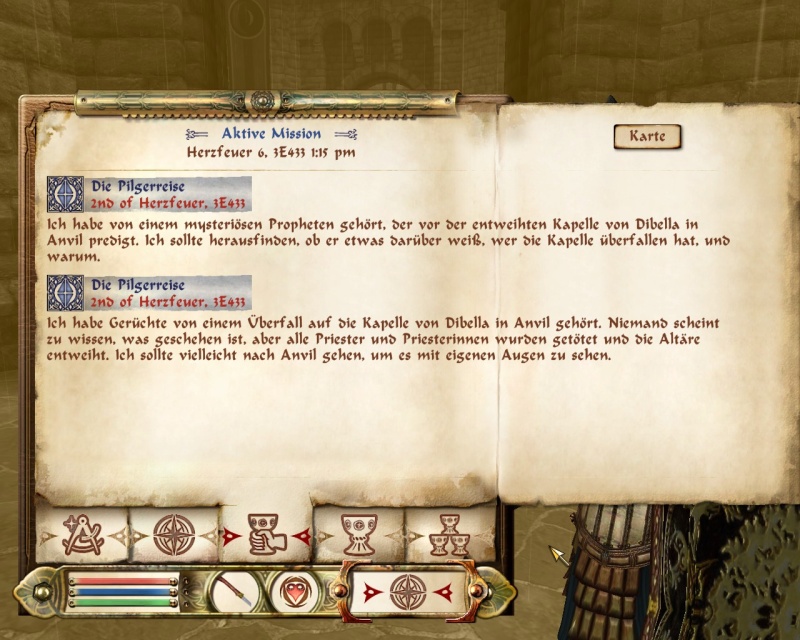 5. Erst einmal solltest du bei Spielstart einige Quests und Zettel bekommen, zum Beispiel gibt es die Pferderüstung bei Snak-gra-bura, von der man automatisch eine Notiz ins Inventar bekommt bei Spielstart. Auch ein Prophet sollte vor der Kapelle von Anvil stehen. Der Rest wird mit Quest, die ebenfalls bei Spielstart anfangen, gelöst.