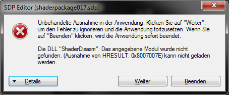 Ich hab den Shader Editor noch nicht drauf, (der Link scheint nicht zu funktionieren, selbst wenn ich nur auf die Homepage klicke. Da erscheint entweder eine Fehlermeldung: Die Seite konnte nicht gefunden werden, oder es erscheint die T-Online Navigationshilfe) deswegen solltest du es mal mit dem Kompatibilitäts Modus probieren. Einfach auf die Anwendung Rechtsklick-> Eigenschaften-> Kompatibilität -> Kompatibilitätsmodus aktivieren -> Windows XP auswählen (ist normal schon voreingestellt).