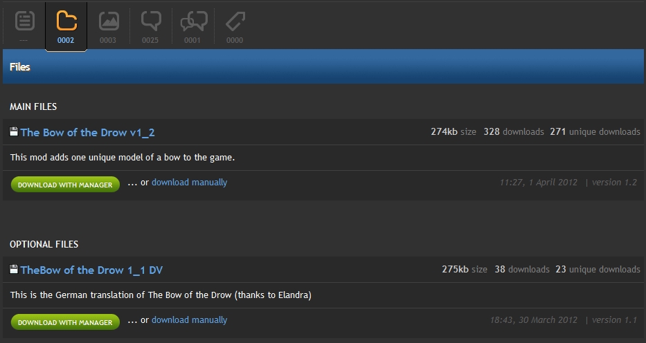 Diese Mod fügt den "Dunkelelfenbogen" in der Höhle am Hobswasserfall ein. Er befindet sich in der "End"-Kammer bei der toten kaiserlichen Frau, die von den Totenbeschwörern "bearbeitet" wird.