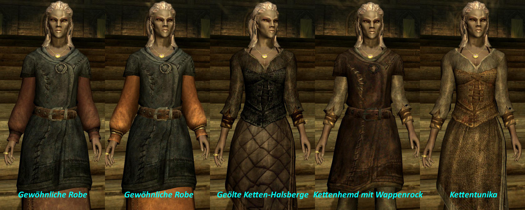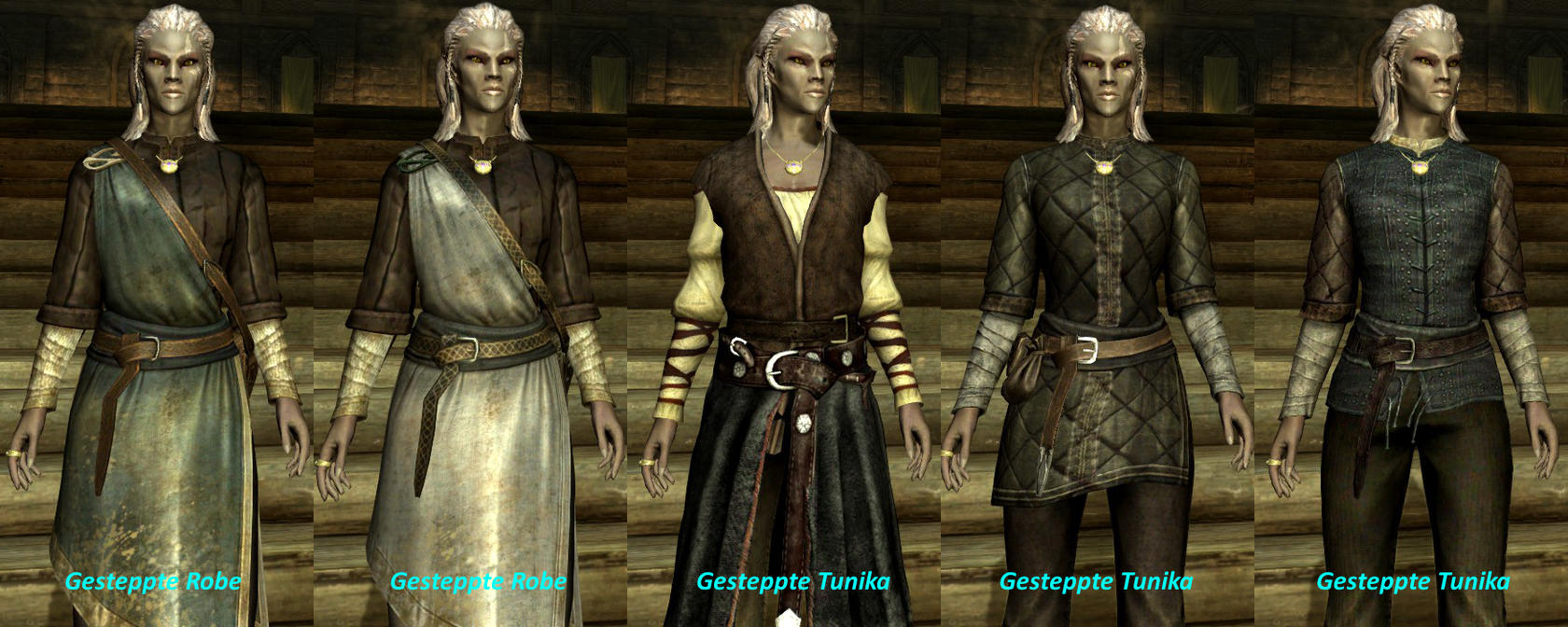 Wenn du die Sachen in der Konsole ercheaten möchtest: Die Namen der Outfits, von denen es viele Varianten gibt, sind: Common Robes, Hooded Common Robes, Quilted Tunic, Quilted Robes.