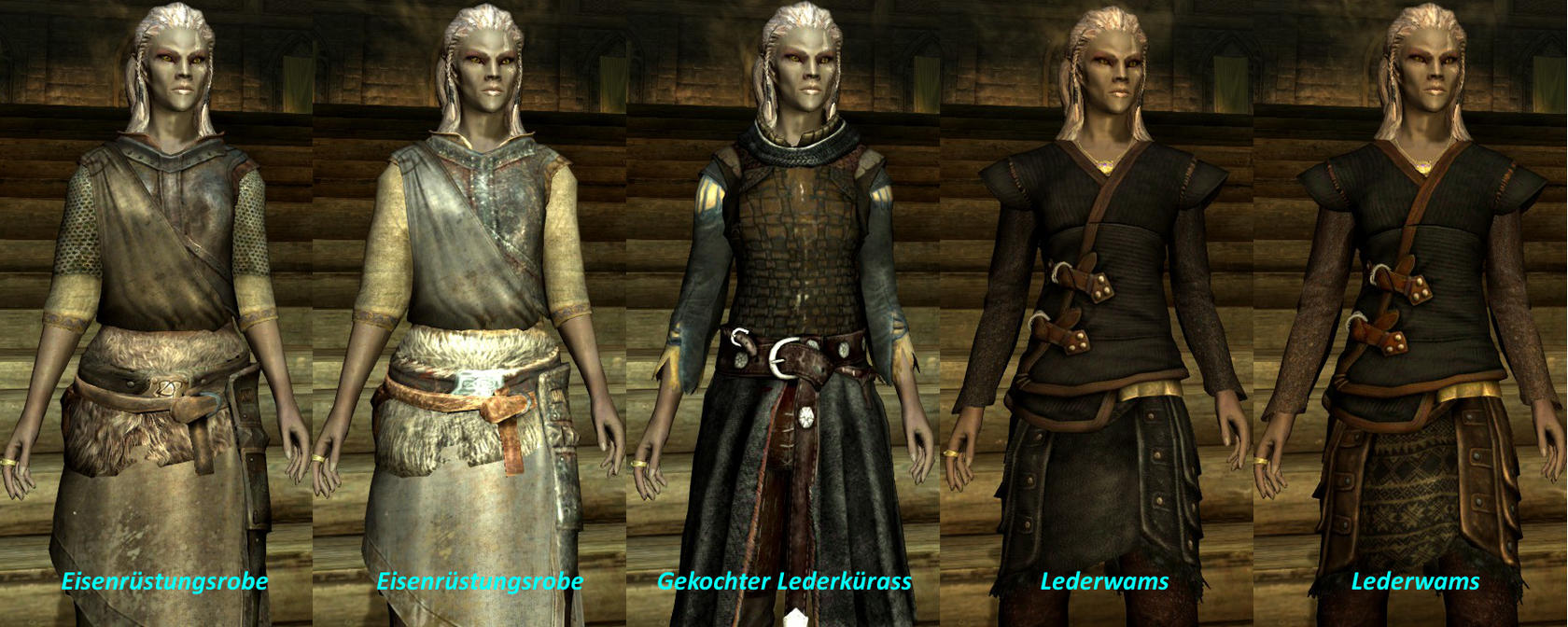 Die Namen der Rüstungen sind: Robed Iron Armor, Boiled Leather Cuirass, Nordic Iron Plates, Leather Doublet, Mail Tunic, Mail and Surcoat, Mail and Jacket, Oiled Mail Hauberk, Oiled Mail and Surcoat.
