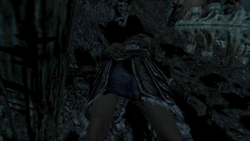 Kaum waren wir auf der anderen Seite angelangt, löste sich unter lautem Grollen ein großer Felsbrocken von der Decke und zerstörte die Brücke. Unter der Brücke entdeckte ich kleinen Durchgang. Neugierig, wie ich war, ließ ich Hadvar stehen und sprang stattdessen hinunter und krabbelte durch das Loch. Ich stieß auf ein Skelett, dass hier wohl schon länger vor sich hinfaulte, und auf ein Säckchen Gold. Zumindest würde ich mit Geld in der Tasche sterben.