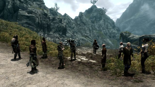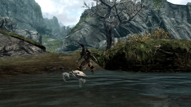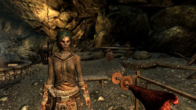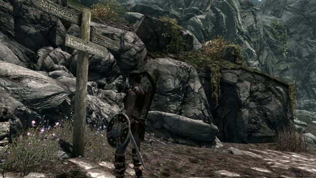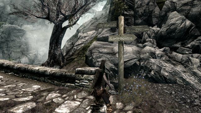 Ansonsten war es allerdings eine sehr hübsche Gegend. Gemächlich wanderten wir an einem in der Abendsonne glitzernden Bach entlang, als hätte es den Drachenangriff auf Helgen und unsere spätere Flucht nie gegeben. Bei einer kleinen Ansammlung seltsamer Steine mit leuchtenden Gravuren und je einem etwa kopfgroßen Loch am oberen Ende legten wir eine kurze Rast ein.