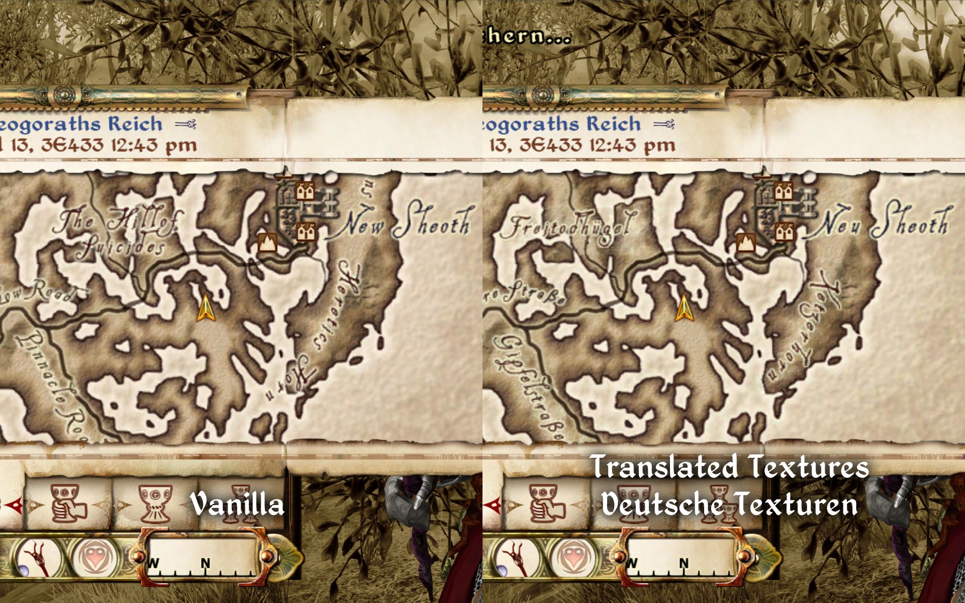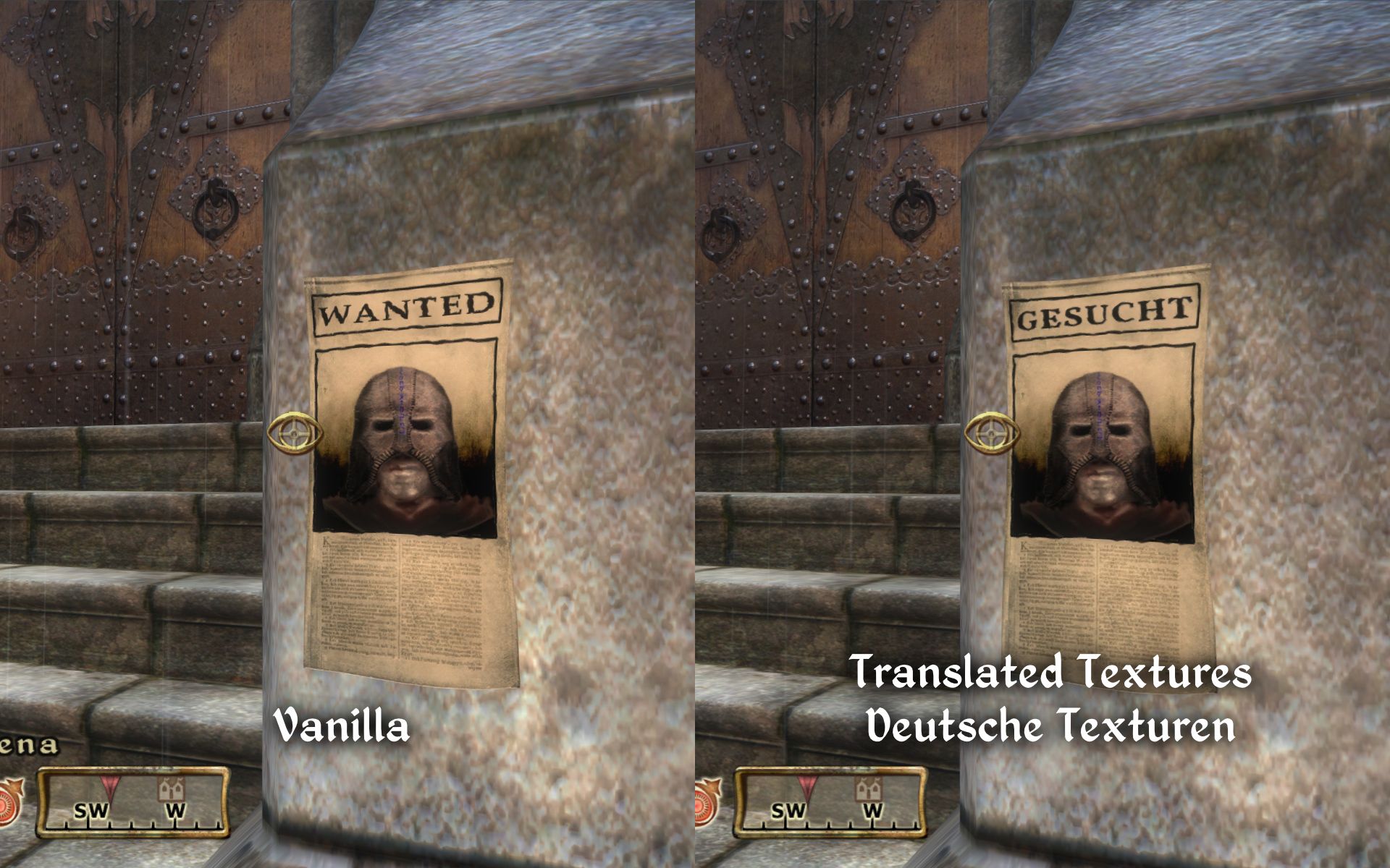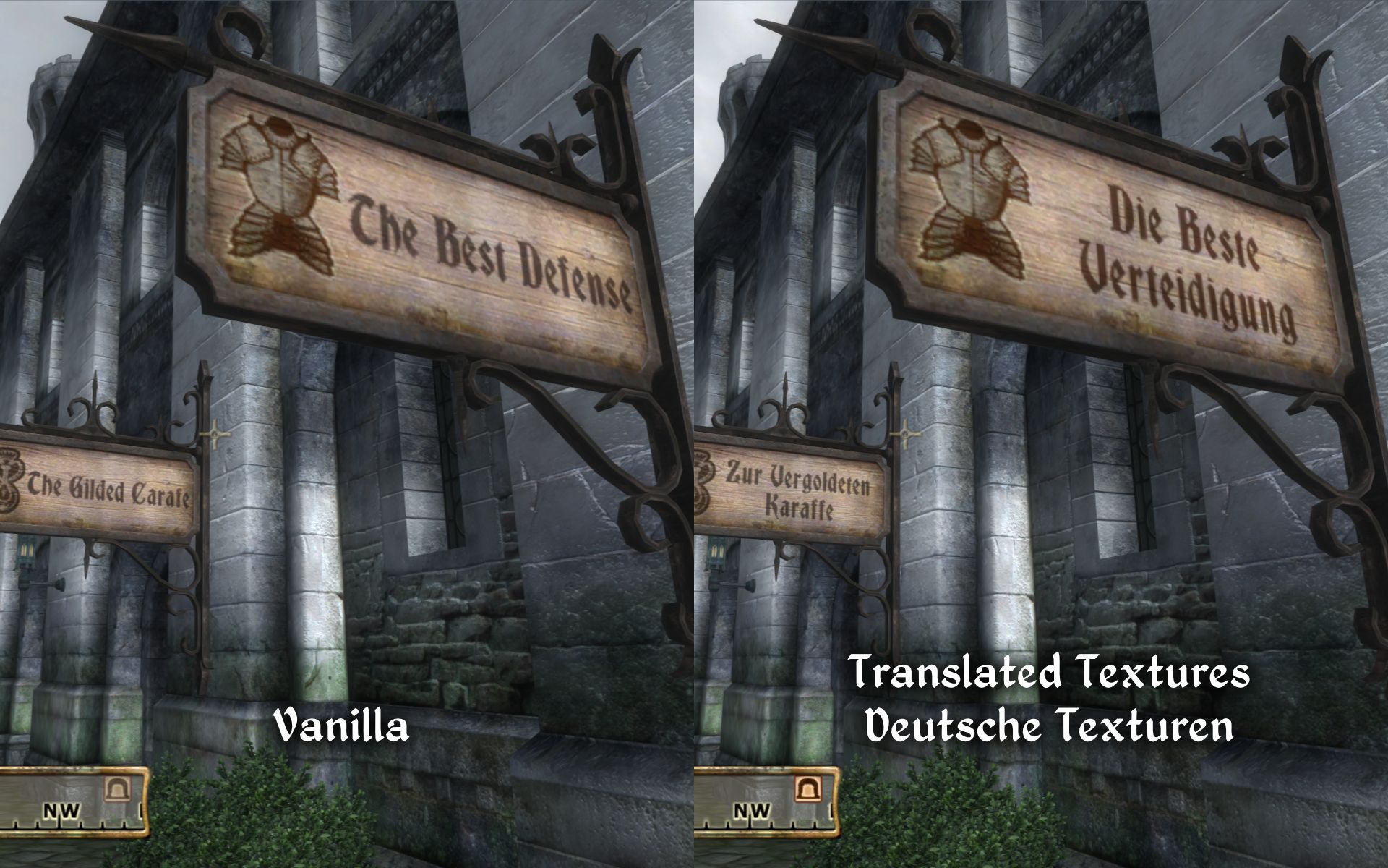 Deutsche Texturen ist ein Texture replacement mod, der alle Texturen in Oblivion (und allen DLCs!) mit englischem Text durch eine deutsche Kopie ersetzt. Dies umfasst Laden- und Sraßenschilder, Flugblätter, Plakate, Flaschen, Weltkarten (Cyrodiil und Shiving Isles), ja sogar den Kompass.
