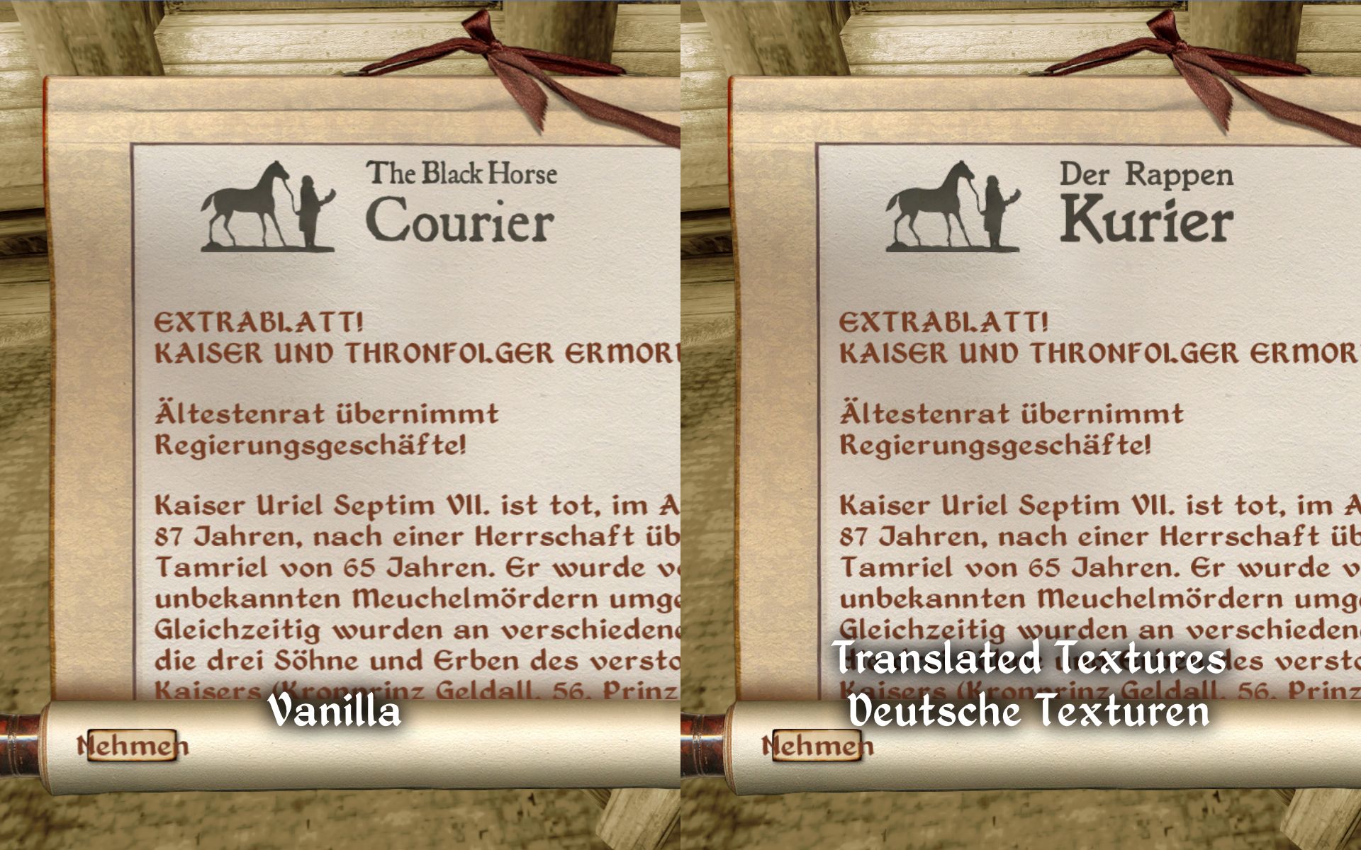 Mich persönlich hat es schon immer gestört, dass die deutsche Version von Oblivion voll mit englischsprachigen Texturen ist. Gleichzeitig hat es mich auch etwas verwundert, dass es bisher noch keinen Mod gab, der das ändert. Daher entschied entschied ich mich vor Kurzem, das hier zu machen:
