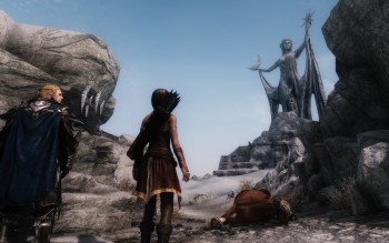 In Hillgrunds Grab, war weit und breit niemand zu sehen. So ein Mist, wo steckt der Kerl denn jetzt. Nach unendlichen zwei Stunden, kam er dann mit einem erlegten Reh die Stufen rauf. Er schaute mich lange an, dann sagte: "Wie ich sehe, warst du erfolgreich, schön siehst du wieder aus". Nachdem wir das Reh zubereitet und gegessen hatten, fragte ich ihn, ob er Lust hätte mich zu begleiten. Ja, sehr gerne würde er es tun und so brachen wir am nächsten Morgen gemeinsam auf. Ich schaute ihn prüfend von oben bis unten an und meinte mehr beiläufig: "Ähm, ich weiss ja nicht, wie sehr du an deiner Eisenrüstung hängst, ich habe da noch zufällig was in meinem Gepäck, wo ich noch nicht zum verkaufen gekommen bin". Ich kramte etwas in meinen unendlichen Rucksack und holte wie zufällig die Ebenerzrüstung raus. Was die ist für mich! Er strahlte über das ganze Gesicht, als er sie dann an hatte. Und so zogen wir los, um gemeinsam einige meiner noch unerledigten Auträge zu erledigen. Tage später in der Tundra, kamen wir an einer Mammutfamilie vorbei. Als er sah, dass ich einen Feuerball vorbereitete, meinte er etwas ärgerlich, warum willst du diese sanften und schönen Tiere töten? Soviel Fleisch brauchen wir doch nicht! Geht ja gut los, aber vielleicht hat er ja recht. Stunden später, hatten wir dann doch noch Spass. Erst verärgerten wir einen Höhlenbären, an den ich bewusst etwas dichter ran gegangen bin und im Anschluss kam noch ein Säbelzahntieger.