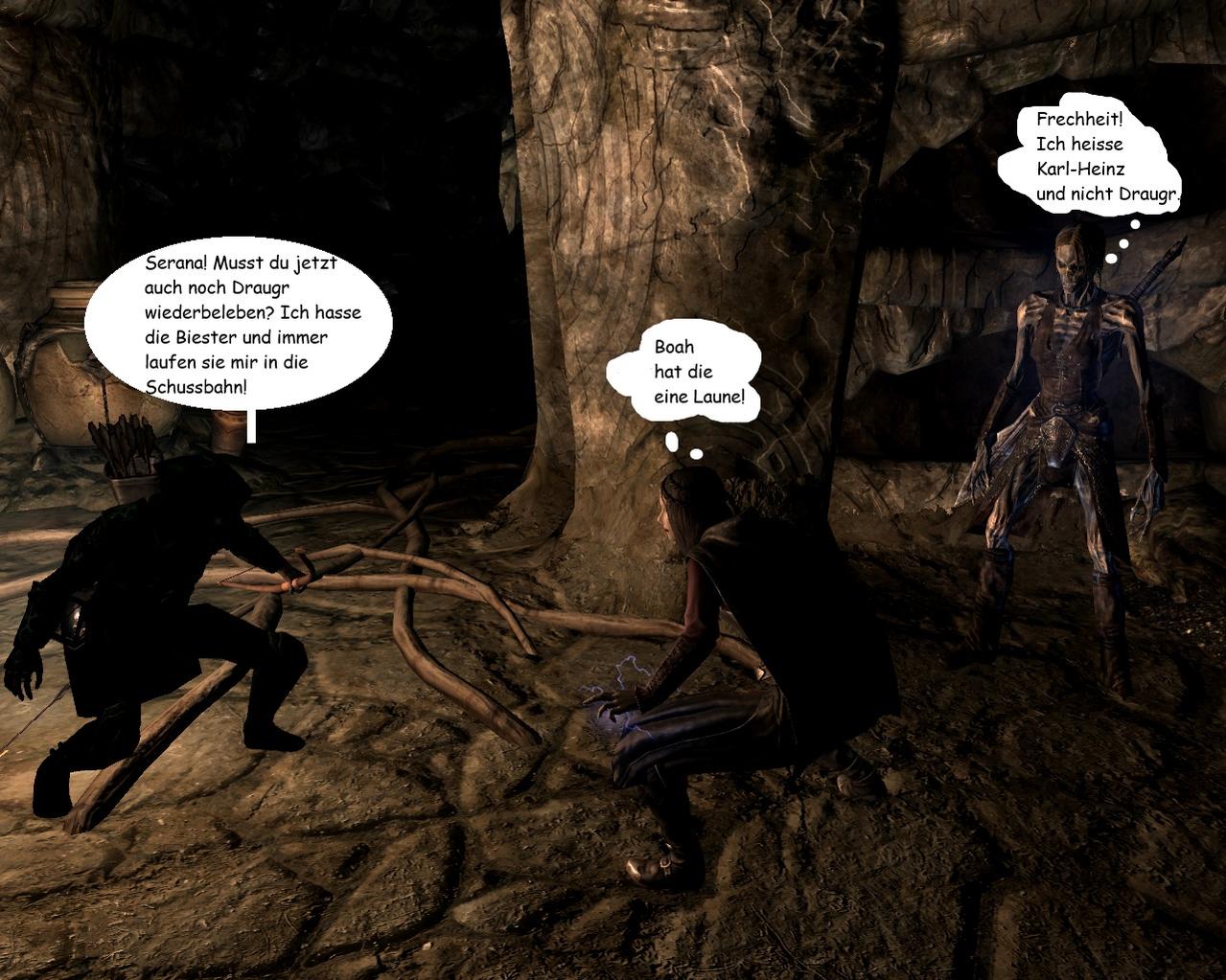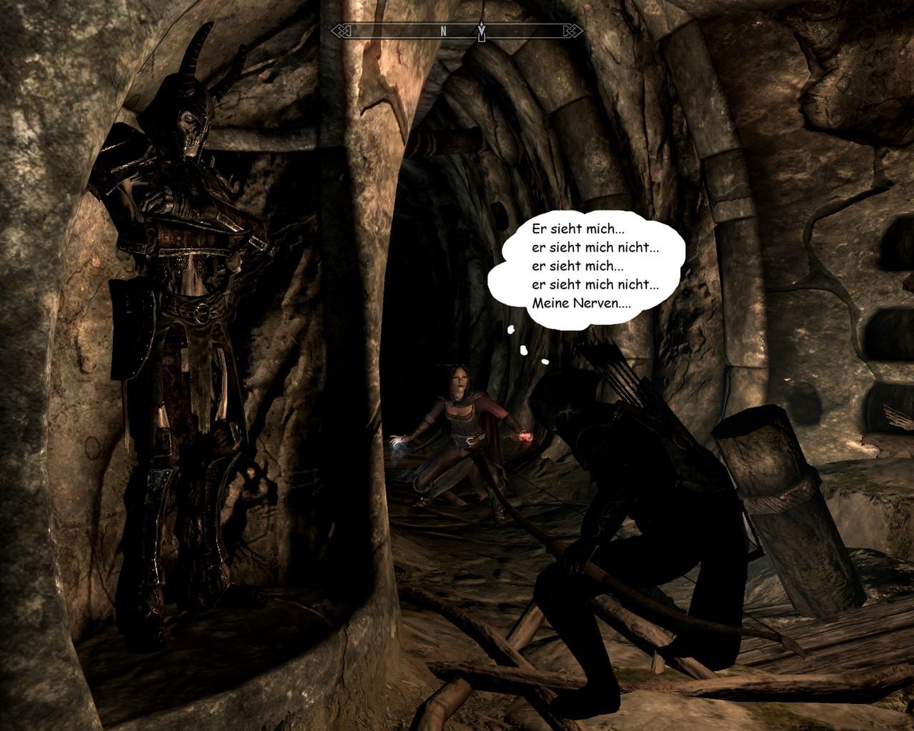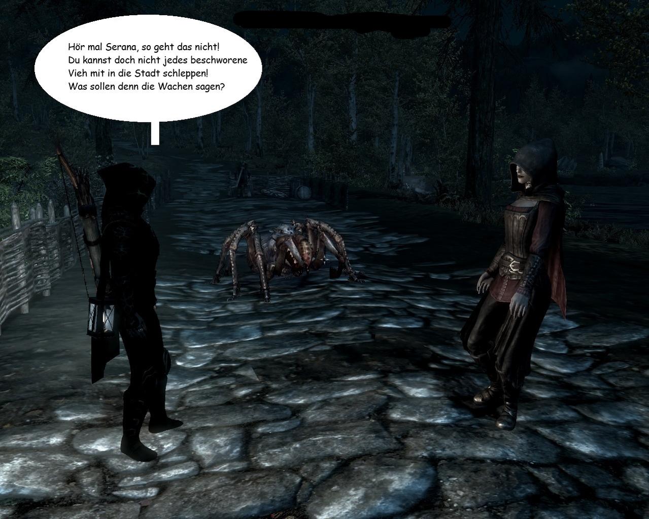 Nicht weit voraus hörte sie Stimmen. Vorsichtig schlich sie sich auf einen Felsvorsprung und spähte nach unten. Dort waren Nord zu sehen, die dort ein Lager aufgeschlagen hatten. Was die Nord nicht sehen konnten, aber für Cassie dank ihrer erhöhten Position gut ersichtlich war, waren die inperialen Soldaten, die überall um die Nord in Stellung gegangen waren.