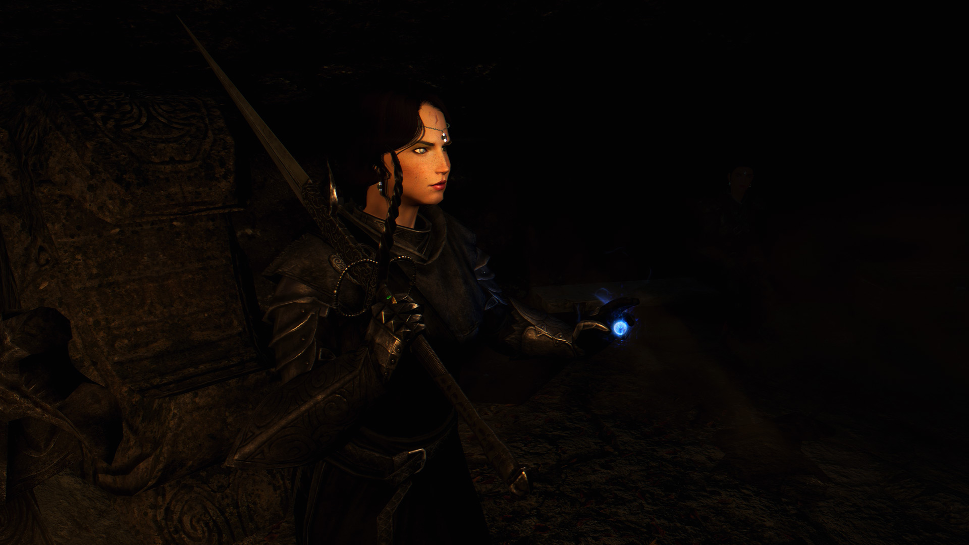 Ist einfach gewaltig, keine künstlichen Beschränkungen mehr, alles geht: Links die Morgul-Klinge, rechts die Blackened Steel Spadone. Oder links der Zweihänder, rechts eine Beschwörung. Rechts meine Ebenerz-Kampflaute, links die Fackel. Natürlich kann man mit einem Zweihänder nur blocken, wenn man nichts in der anderen Hand hat. Mir fehlte es an sich nicht, dass ich keinen Zauber links wirken und keinen Zweihänder rechts in den Kampf führen kann. Aber ich wollte nicht kurz rasch die Waffe wechseln, um einen Beschwörung starten zu können. Das hier macht einen Zweihand-Nekromaten erst richtig möglich, das ist ein krasserer Game-Changer, als ein neuer Perk-Baum.