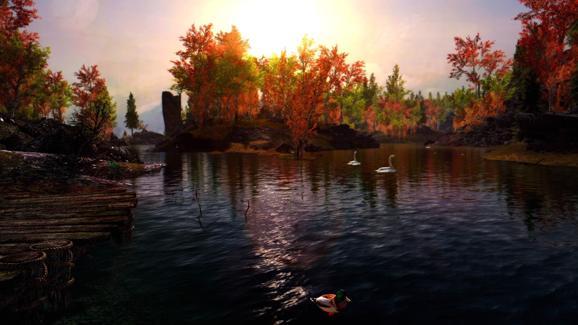 Bin gerade in Rorikstead unterwegs zum Hügelgrab. Ist dieses Kaff schön. Schwäne und eine Enten-Familie im Morgengrauen und eine Galaxie in der Nacht, meine hübschen Mädels dabei, alles neu durch die Nemesis-Engine und Combat Gameplay Overhaul animiert.